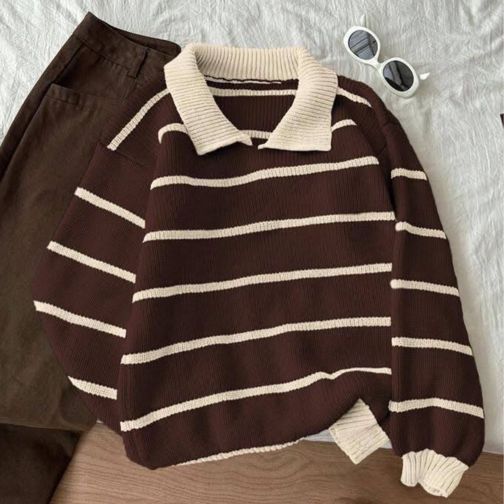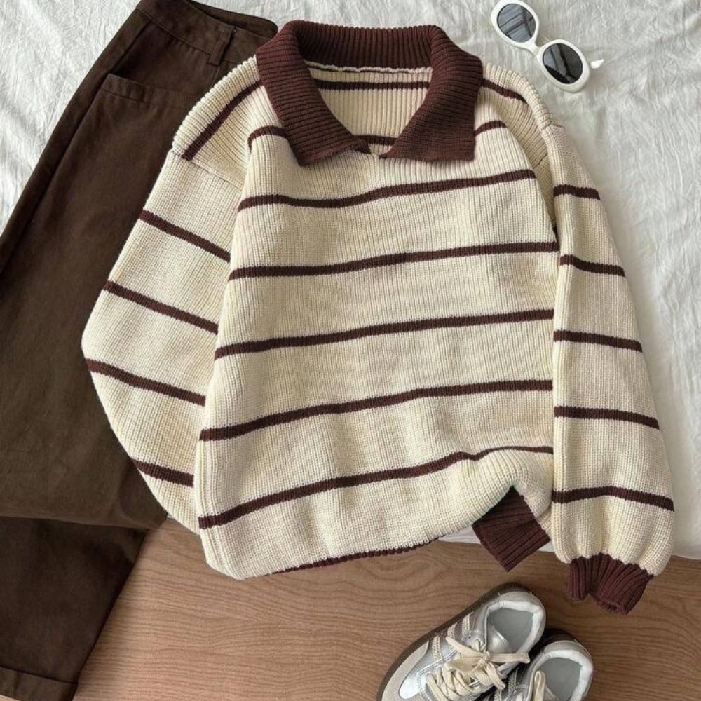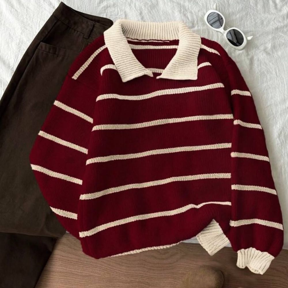 كنزة شتوي خامتها تقيلة وناعمة، تصميمها المخطط باللون النبيتي مع البيج بيدي شكل شيك وسهل يتلبس في أي وقت. عملية جدًا وتناسب الخروجات، الشغل، أو اللبس اليومي في الجو البارد.